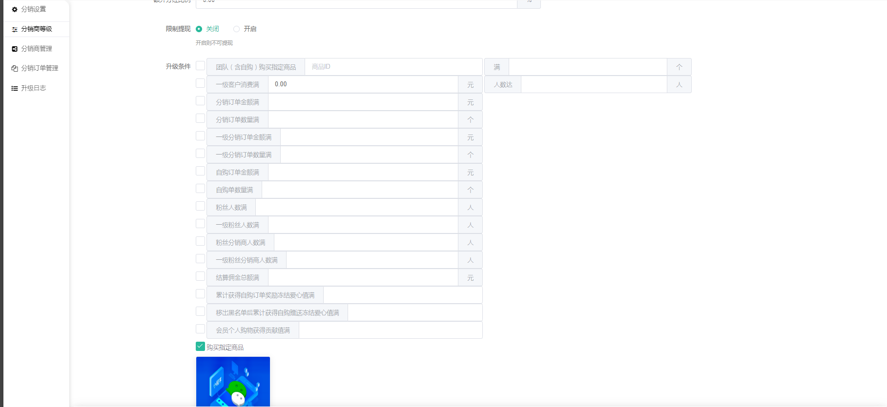 其余分销订单、一级客户消费满、团队购买自定商品满多少个等升级条件的升级方式只能选择完成后。