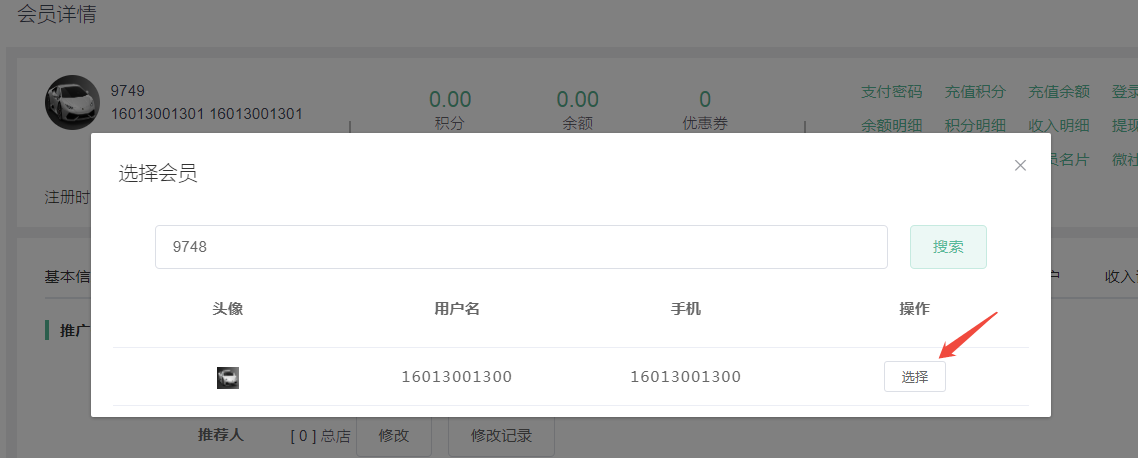 第九步,复制会员ID:9748的9748,找到会员ID:9749点击详情--找到推荐人--开启推广员,点击推荐人的修改按钮--填上一级的会员ID号--保存
