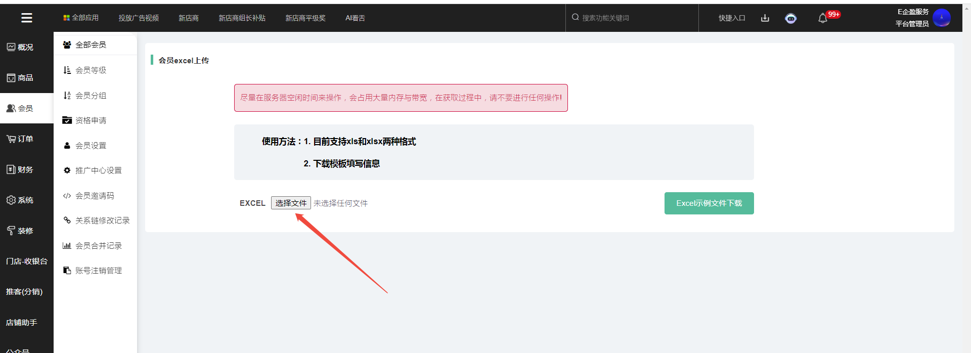 4、第四步,选择图片中,单击箭头方向的选择文件,选择桌面刚刚填写的会员批量导入模板文件