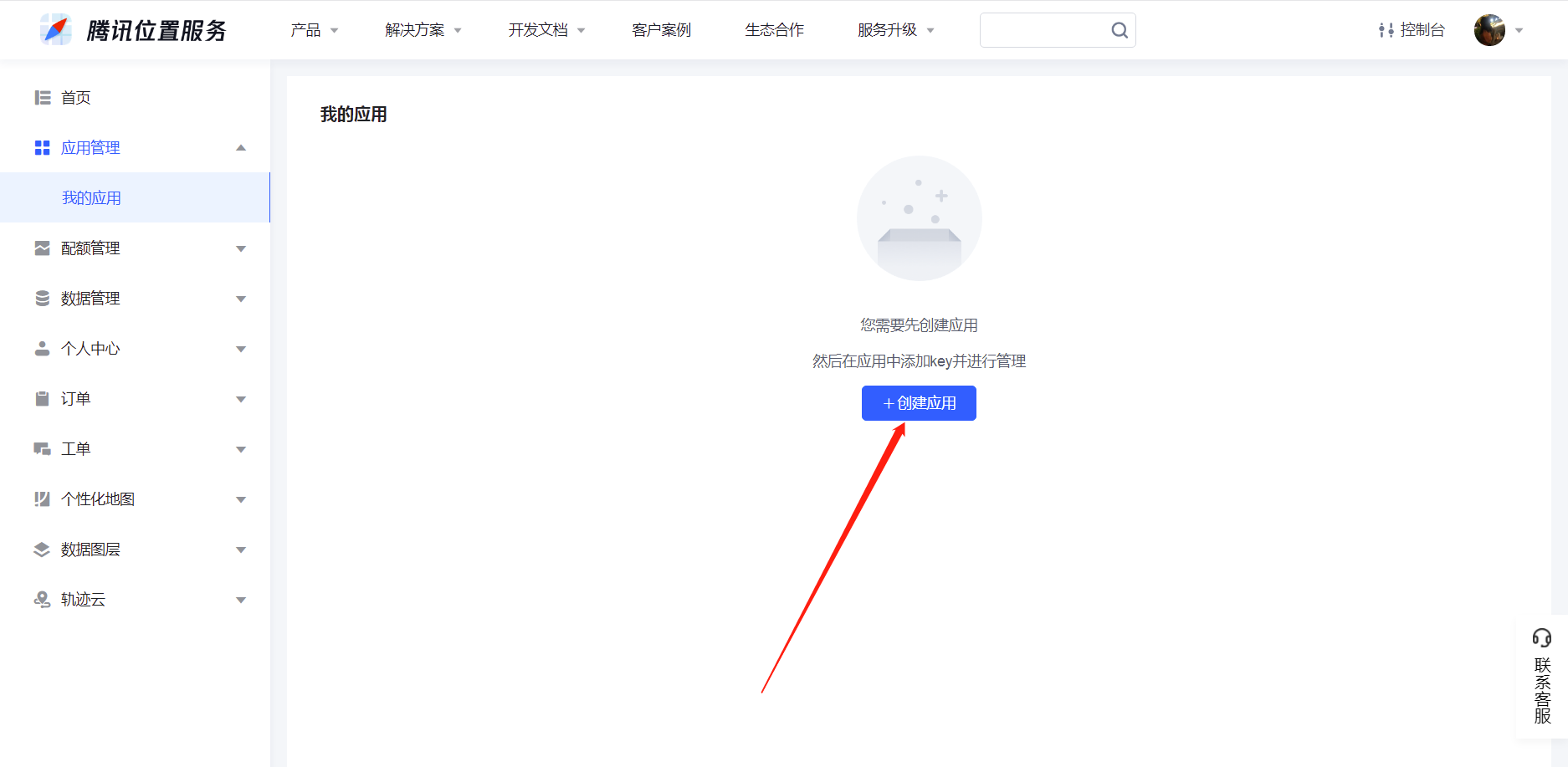 ⑤点击应用管理,我的应用,创建应用(添加key)