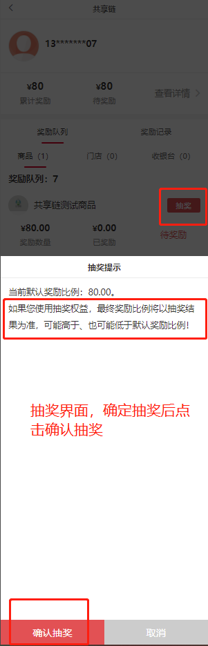 【商品单设置】抽奖奖励权益,用户下单后,取【商品设置】独立比例或者插件默认奖励权益比例作为默认计算,在排队期间(正式奖励前),用户可以进行抽奖,根据抽奖规则获得抽中的奖励权益比例,替换原来默认的比例。抽奖支持固定比例抽奖和随机区间抽奖。